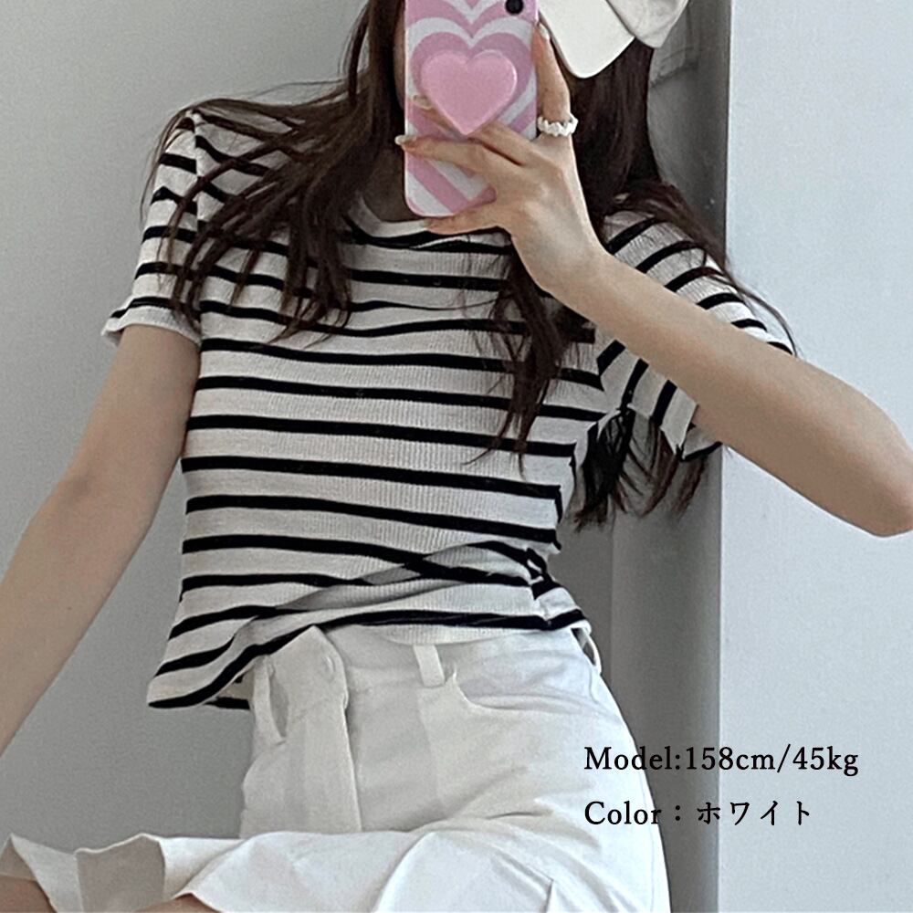 リブ編みニットレディースボーダーTシャツ
