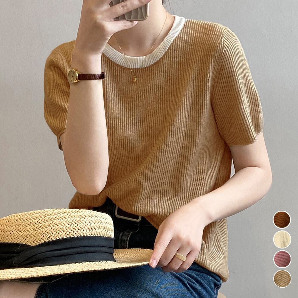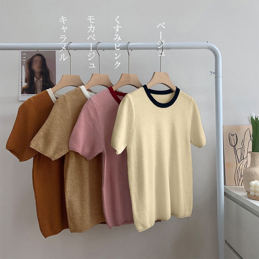 韓国 薄手ニットTシャツ オフィスカジュアル 通勤ニットソー クルーネック ニットトップス 着回し ラウンドネック 夏服