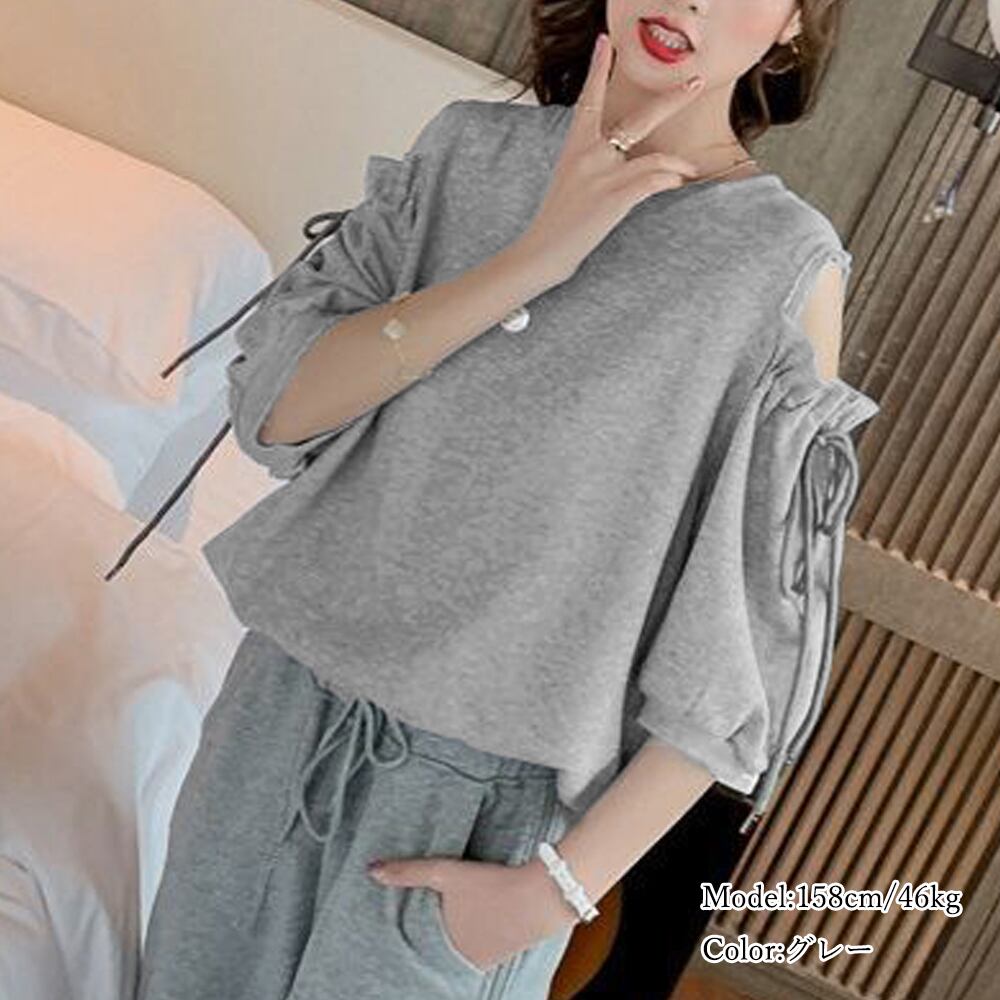 肩開き 韓国風 半袖Tシャツ 体型カバー オフショルダーカットソー カジュアル 無地Tシャツ 大人可愛い 肌見せトップス