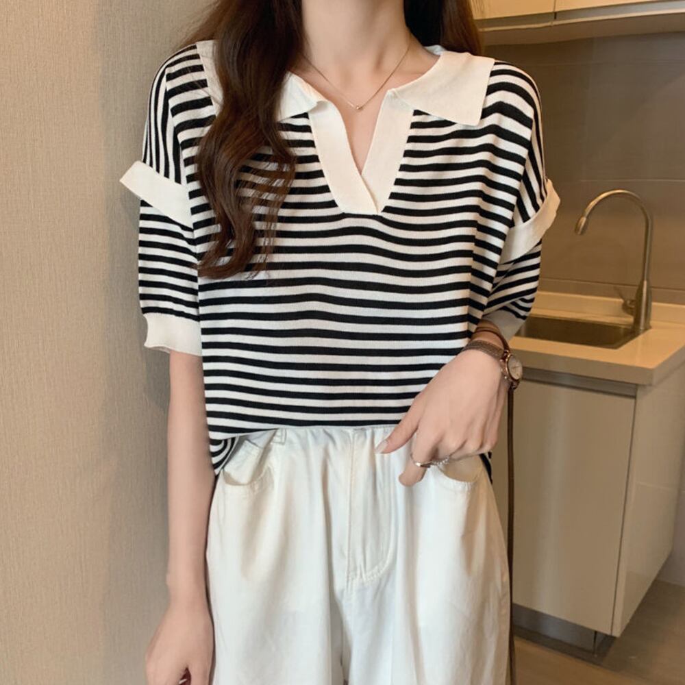 ニットtシャツ 薄手サマーニット 5分袖Vネック 襟付きカットソー ボーダー柄トップス 韓国ファッション カジュアル夏服