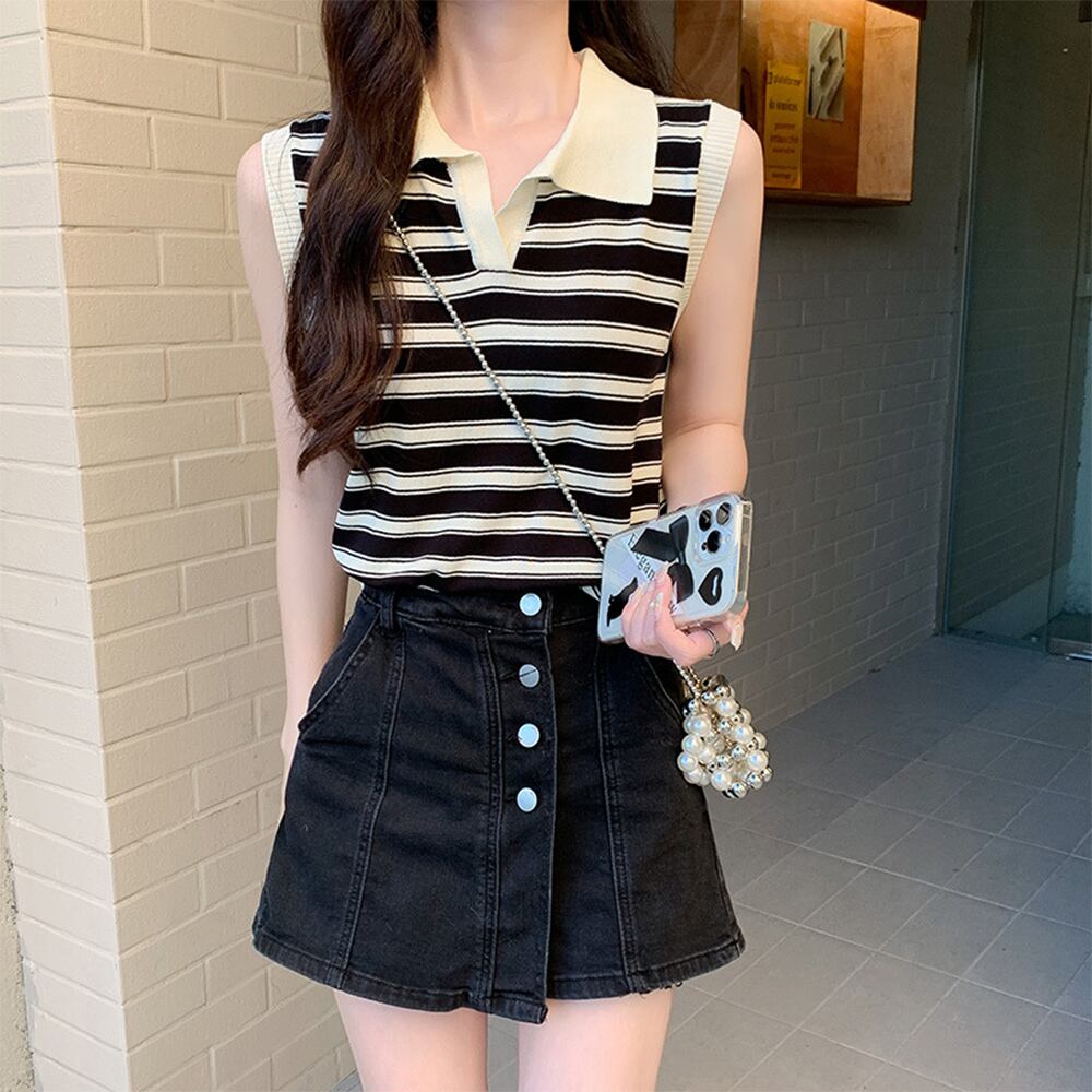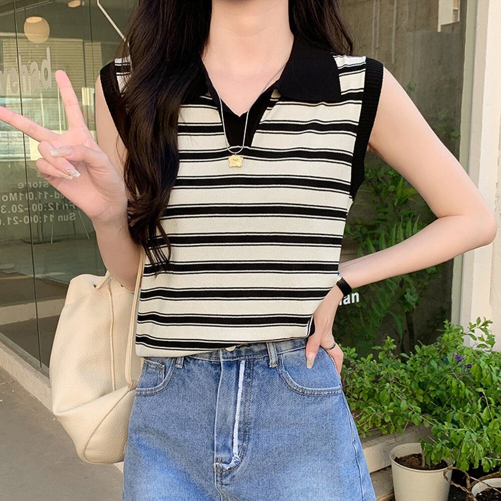襟付き ボーダーニット 袖なしショート丈トップス レディース プチプラ クロップド丈カットソー 1枚で決まる ポロシャツ