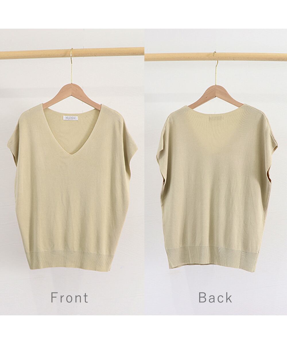 フレンチスリーブ ニットソー 体型カバー vネック 冷感タッチ 半袖 サマーニット きれいめ オフィスカジュアル 着やせ
