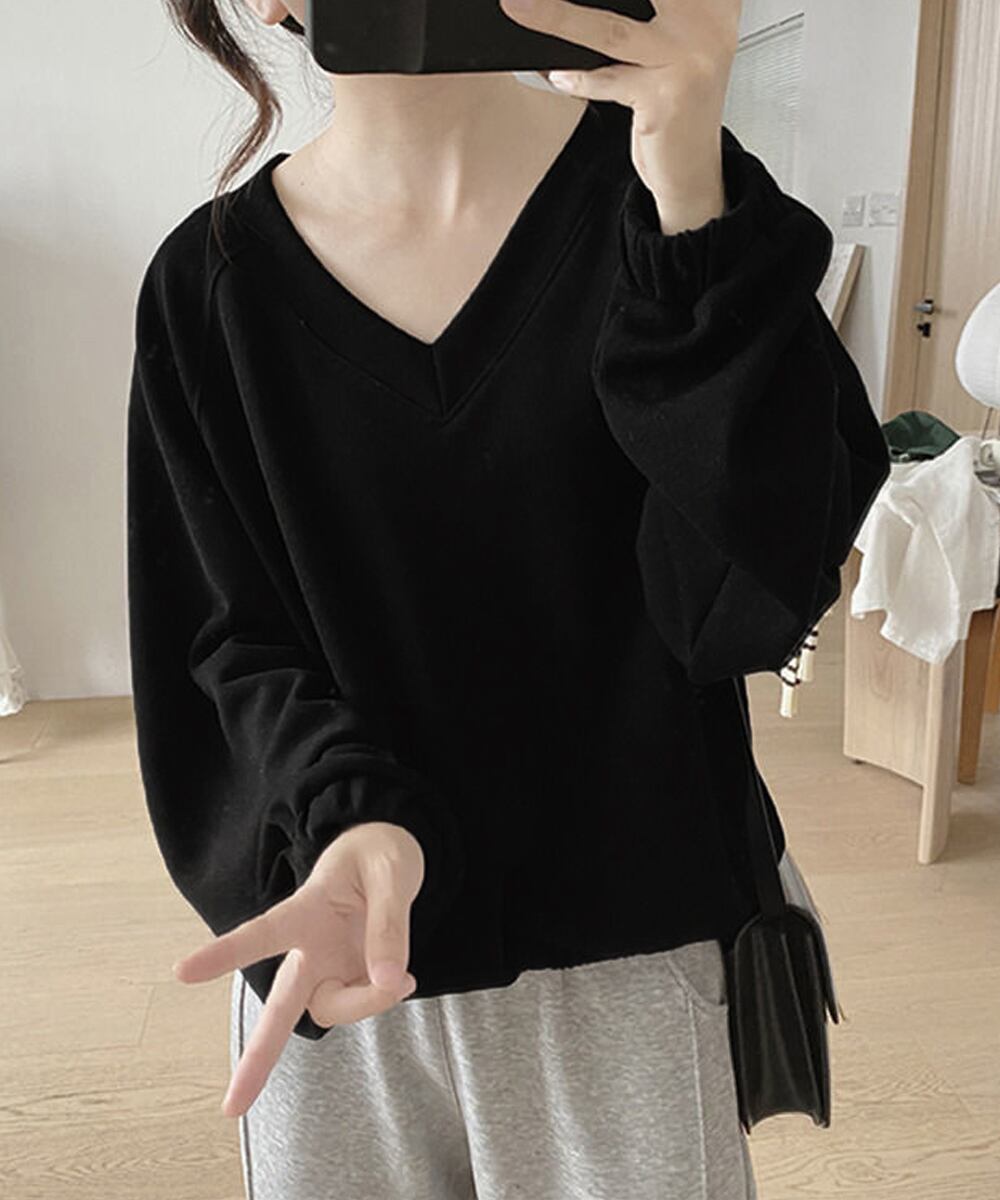 Vネック 着やせ 長袖プルオーバー 無地