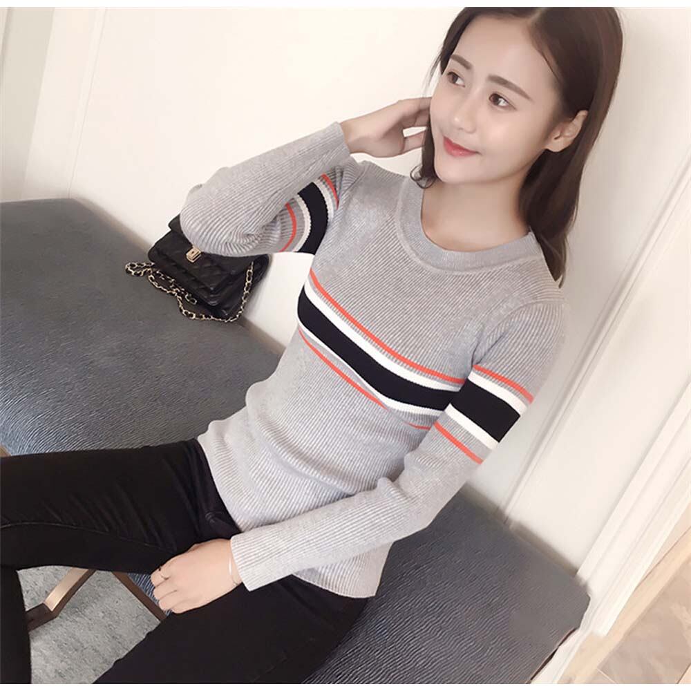 マルチライン クルーネックニット トップス レディース 秋冬 長袖 ニットソー