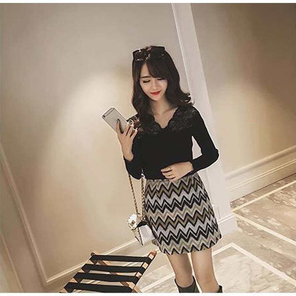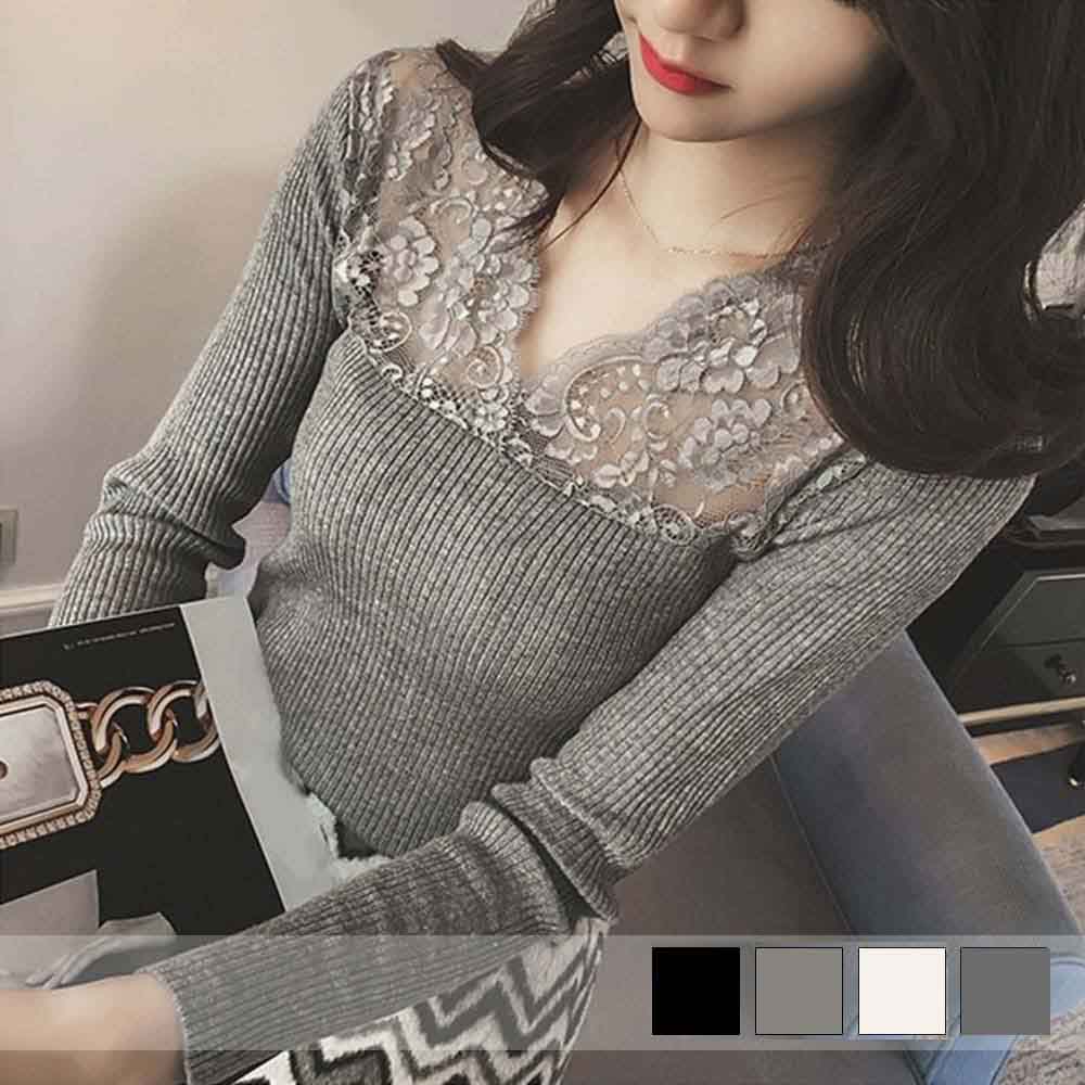 レース切り替え リブニット vネック トップス レディース 秋冬 プルオーバー