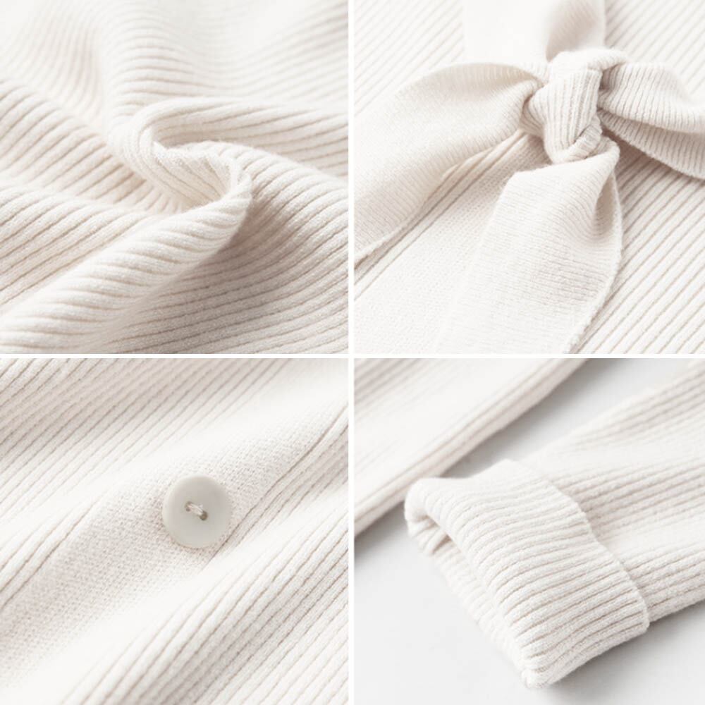 胸元にキュッとリボンを結んで、さりげなくフェミニンな仕上がり飾りボタン付きリブニットトップス