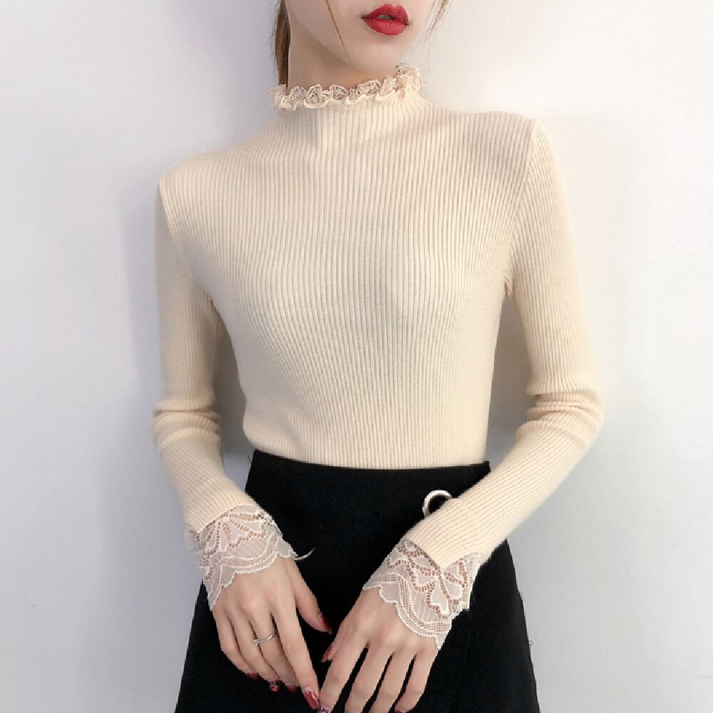 ニットトップス 春秋冬 ニットセーター 長袖 レースハイネックニットソー