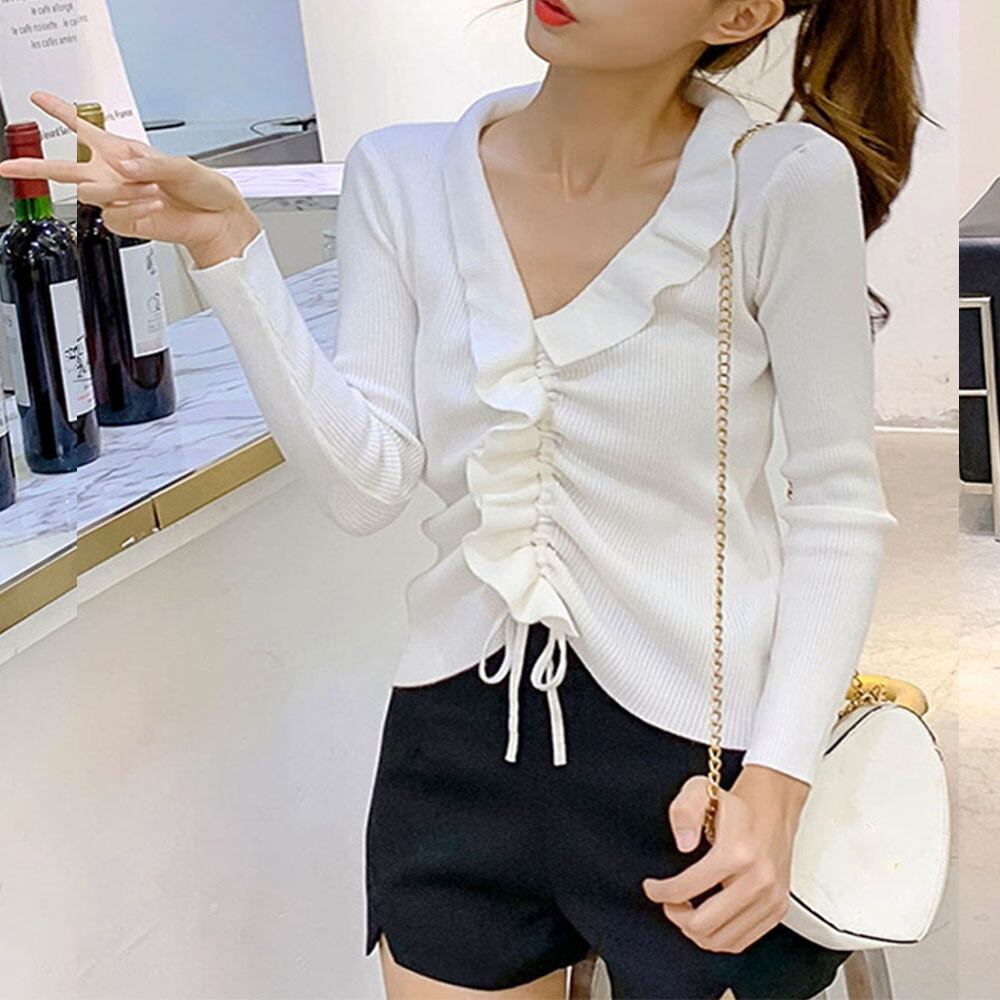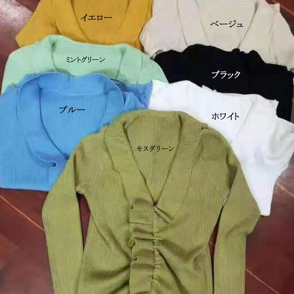 リブニット トップス レディース フリル ドローストリング vネック ニット