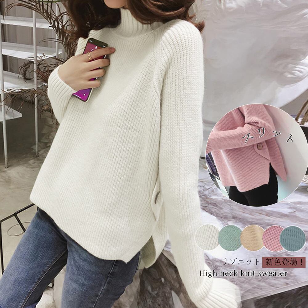 リブニット トップス ハイネック ニット セーター レディース 秋冬 スリット