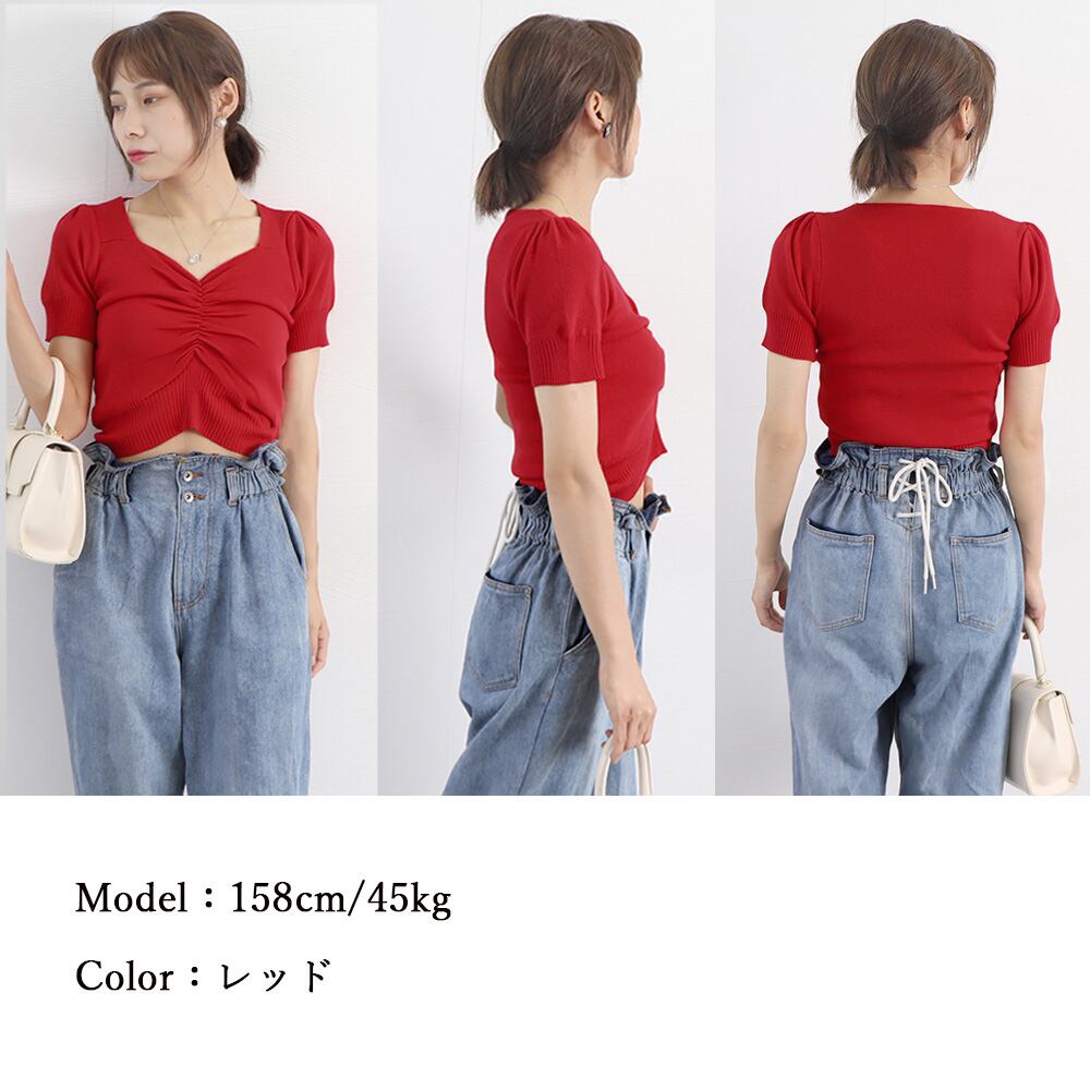 スクエアネック リブニットトップス 半袖 クロップド丈韓国ニットソー 胸元ギャザー セクシーニット おしゃれ20代30代