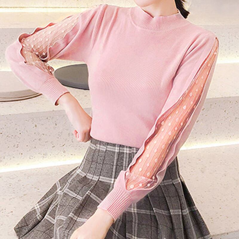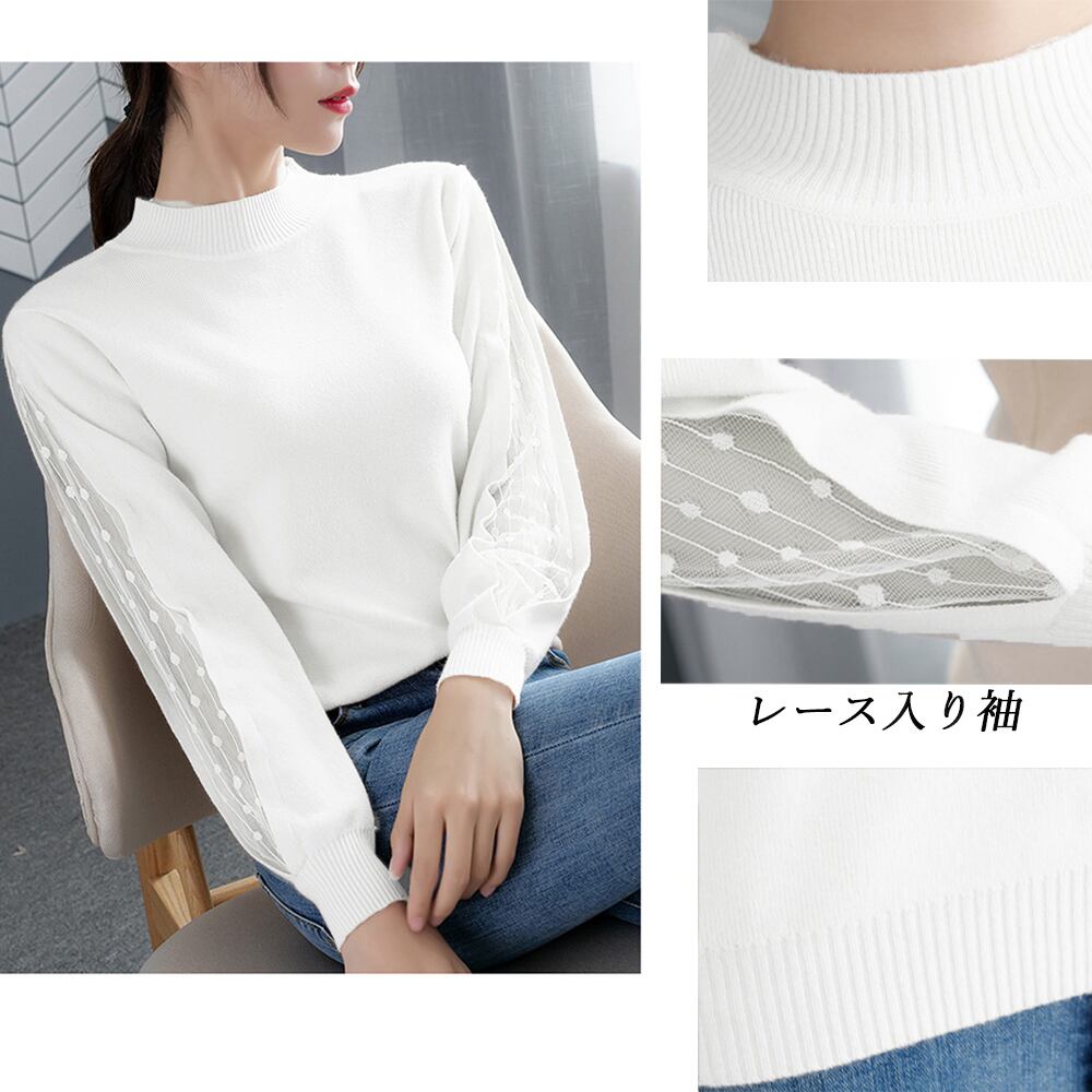ニットトップス クルーネック レディース セーター 袖レース切り替え