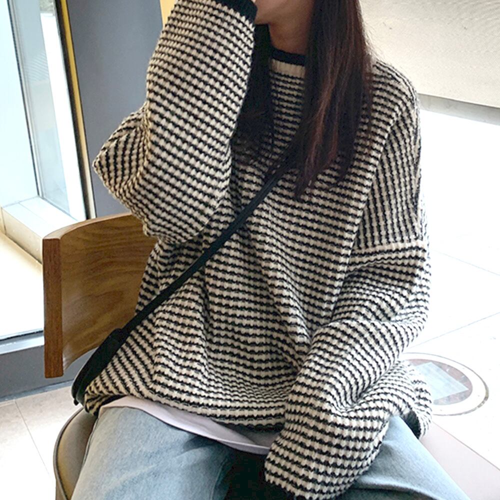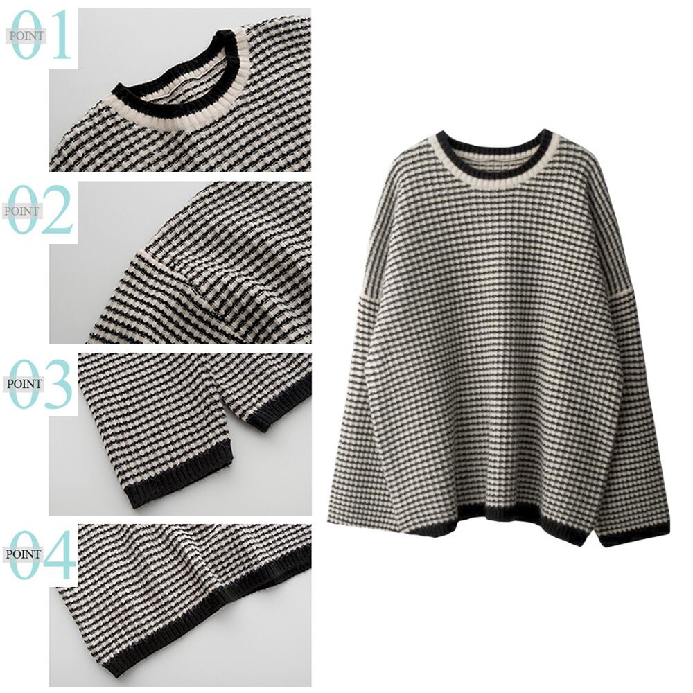 ボーダー柄 ニットトップス レディース ゆったり ラウンドネック