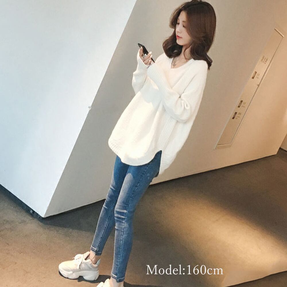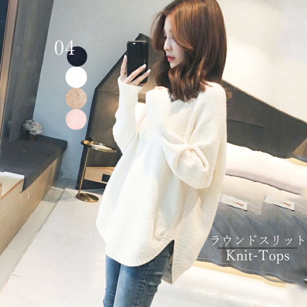 ラウンドスリットニット Vネック ロングニット ゆったり 通勤通学 大人かわいい カジュアル 体型カバー サイドスリット