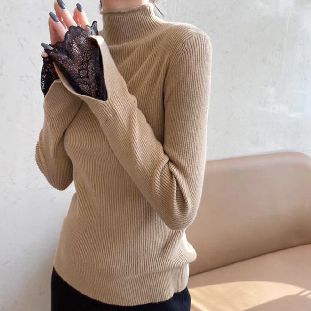 リブ編みでシャープな体のラインを演出、袖先はレース付きで可愛い印象