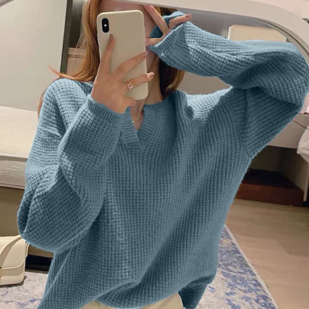 キーネック ニットセーター レディース ゆったり 長袖 リブニット Vネック