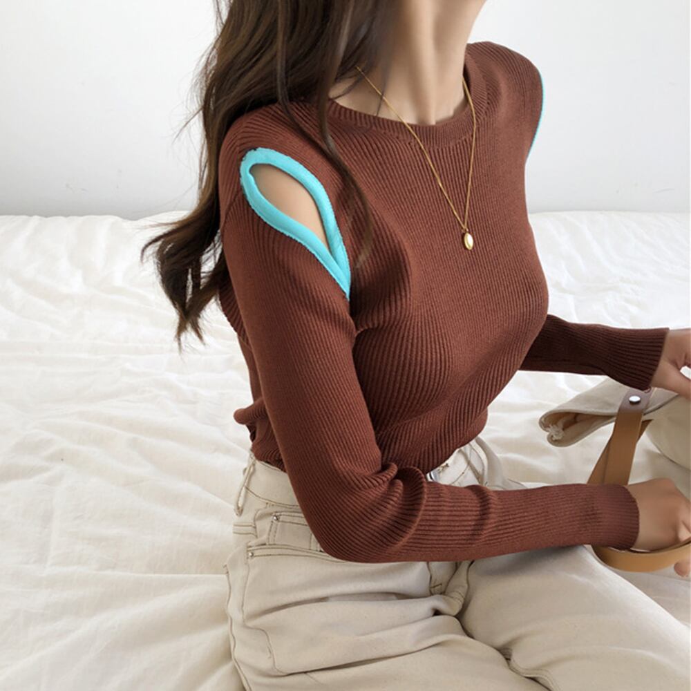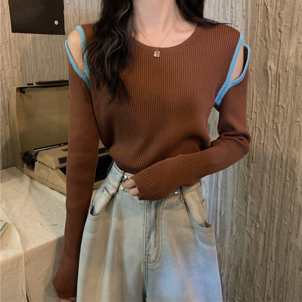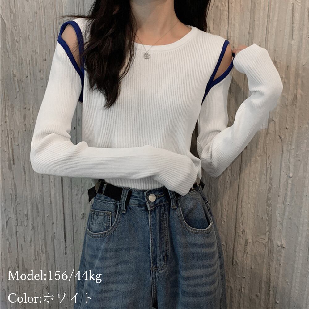 リブニットトップス レディース 肩開き ニットセーター 無地 肌見 ニットソー