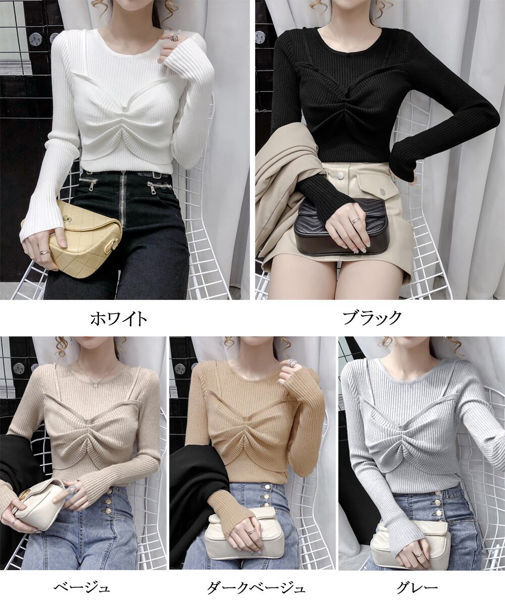 タイトトップス レディース リブニット リボン ニットソー 無地 プルオーバー ニットセーター 大人可愛い