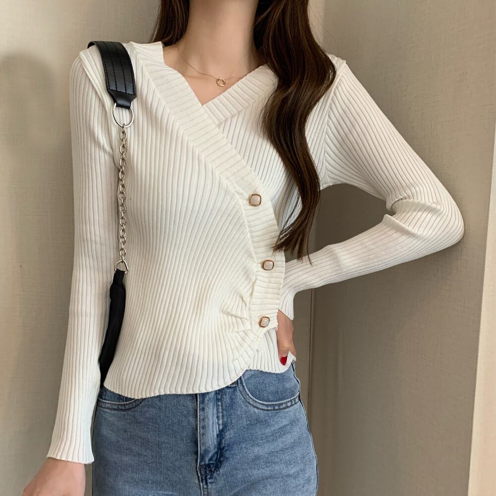 ニットトップス ショート クロスネック リブニット ボダン Vネック