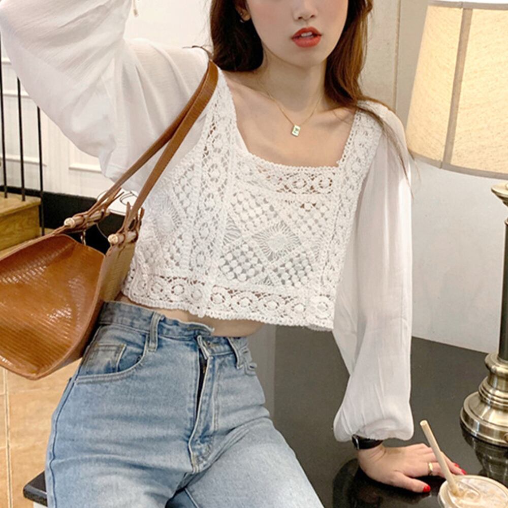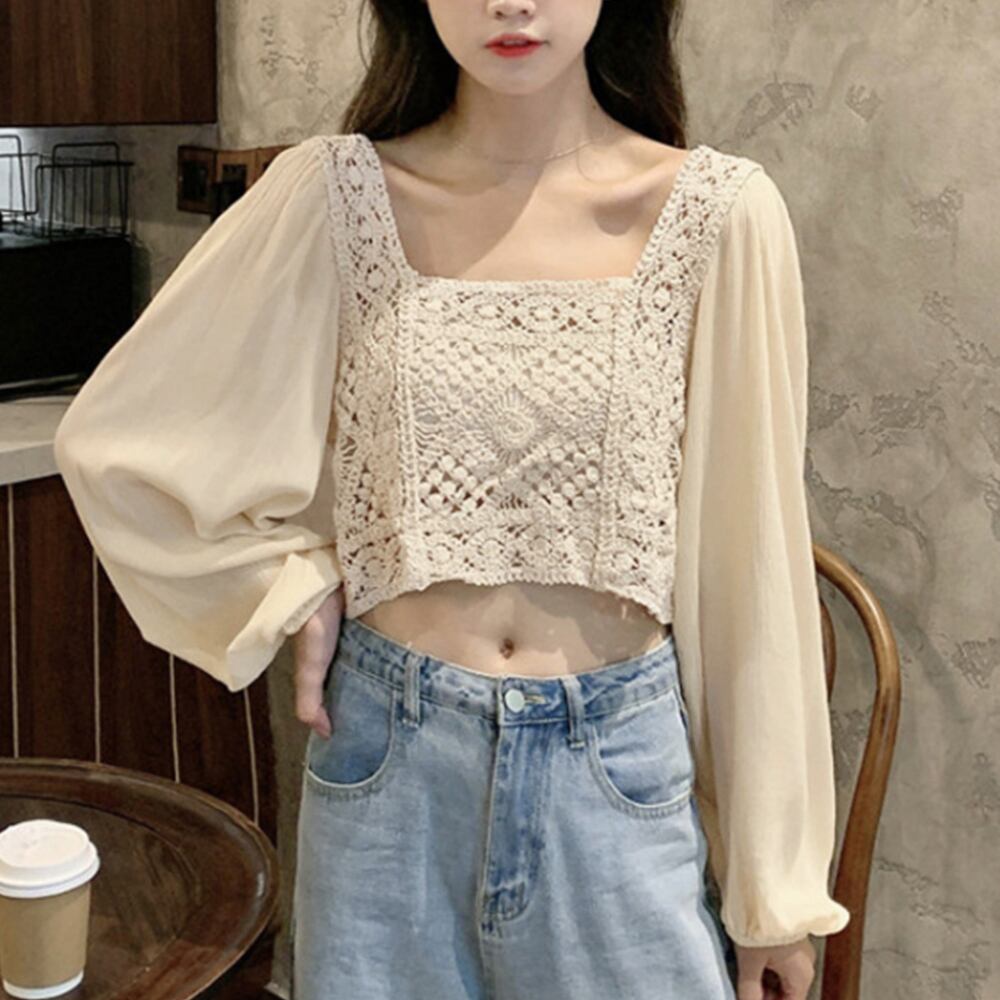 スクエアネック ブラウス レディース 長袖 ショート丈 トップス 透かし かぎ編み 刺繍 レース切替ブラウス