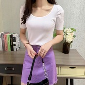 ニットトップス ギャザー クールネック 半袖 ニットセーター パフスリーブ 春夏 タイトニット 無地 薄手 ニットソー リブ編み トップス