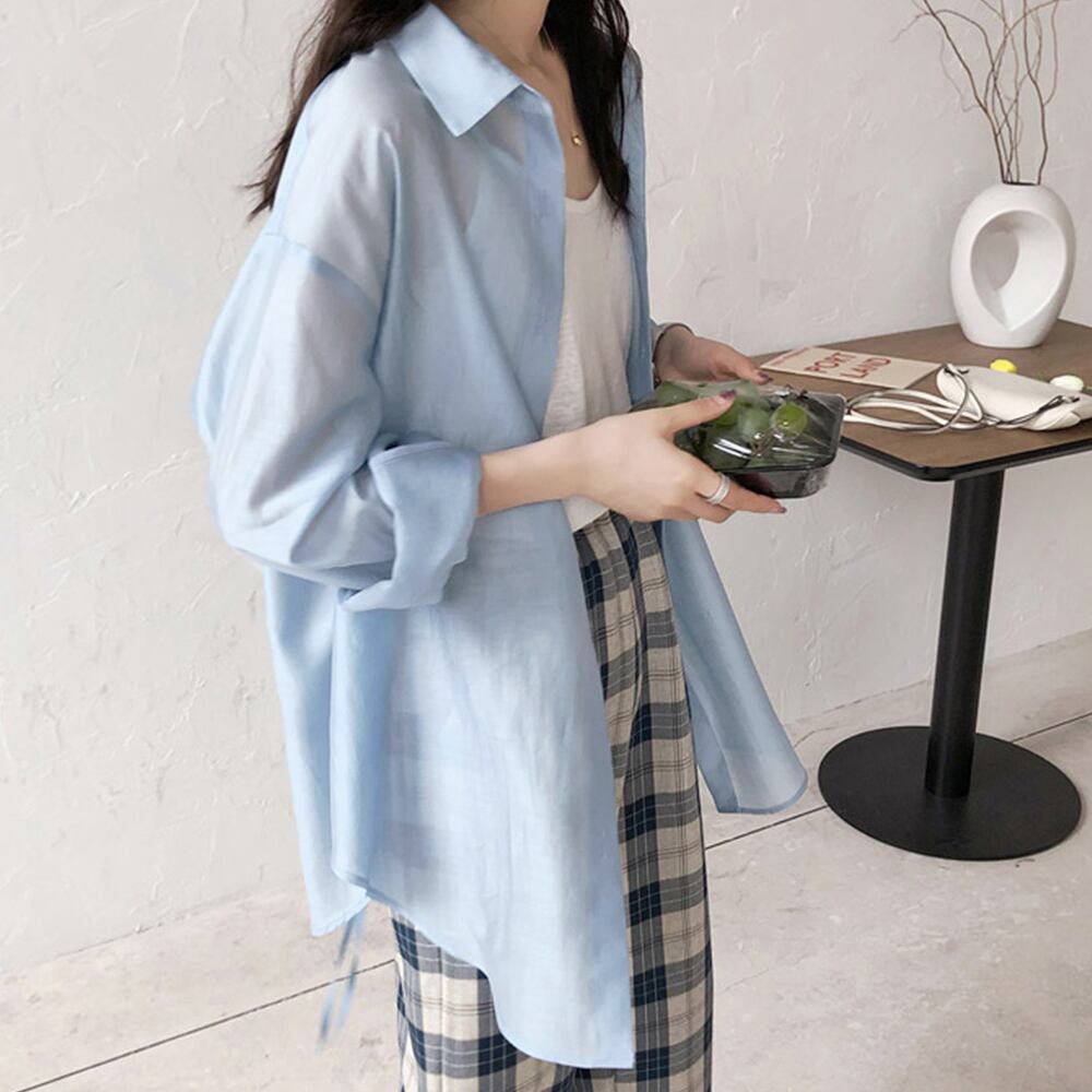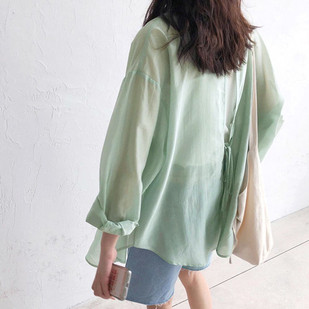 薄手 シアーカーディガン 光沢感 バックスリット 韓国シャツ 無地 トップス 透け感 羽織 長袖 シースルーシャツ