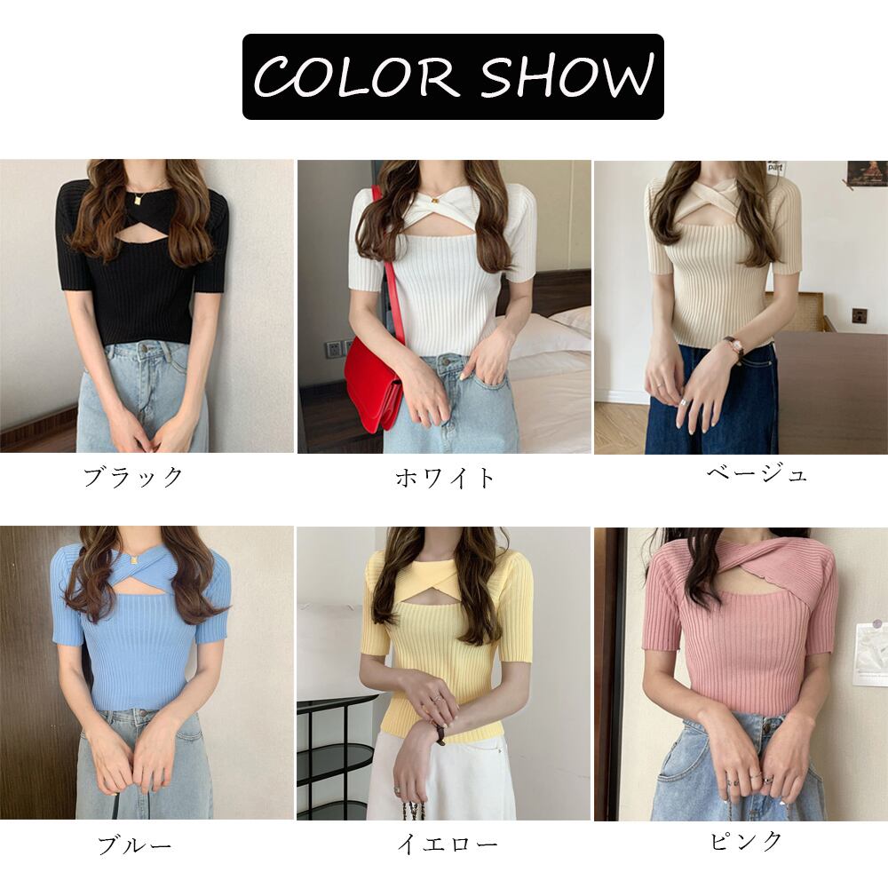 レディース ねじり サマーニット 着やせ ニットソー 薄手 無地 トップス 胸開き 春夏
