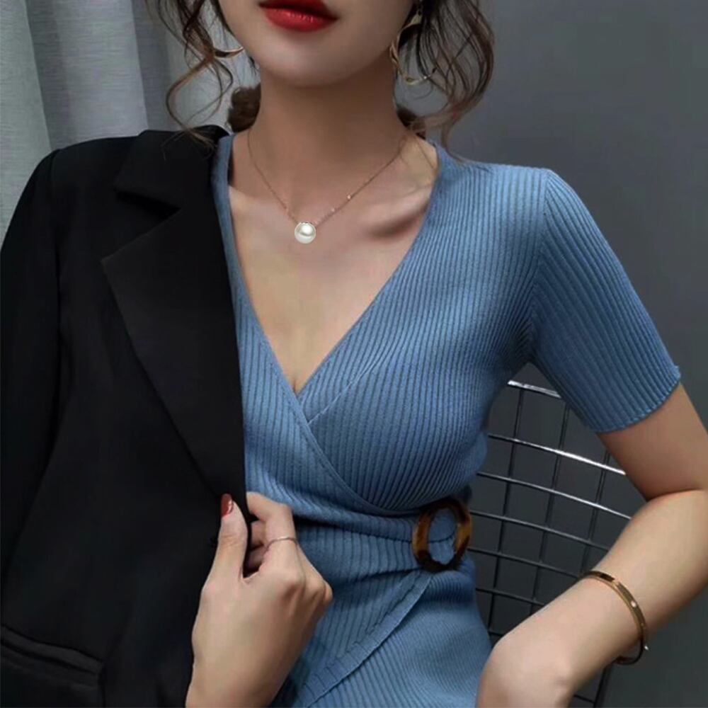 リブ編みニットトップス Vネック 半袖
