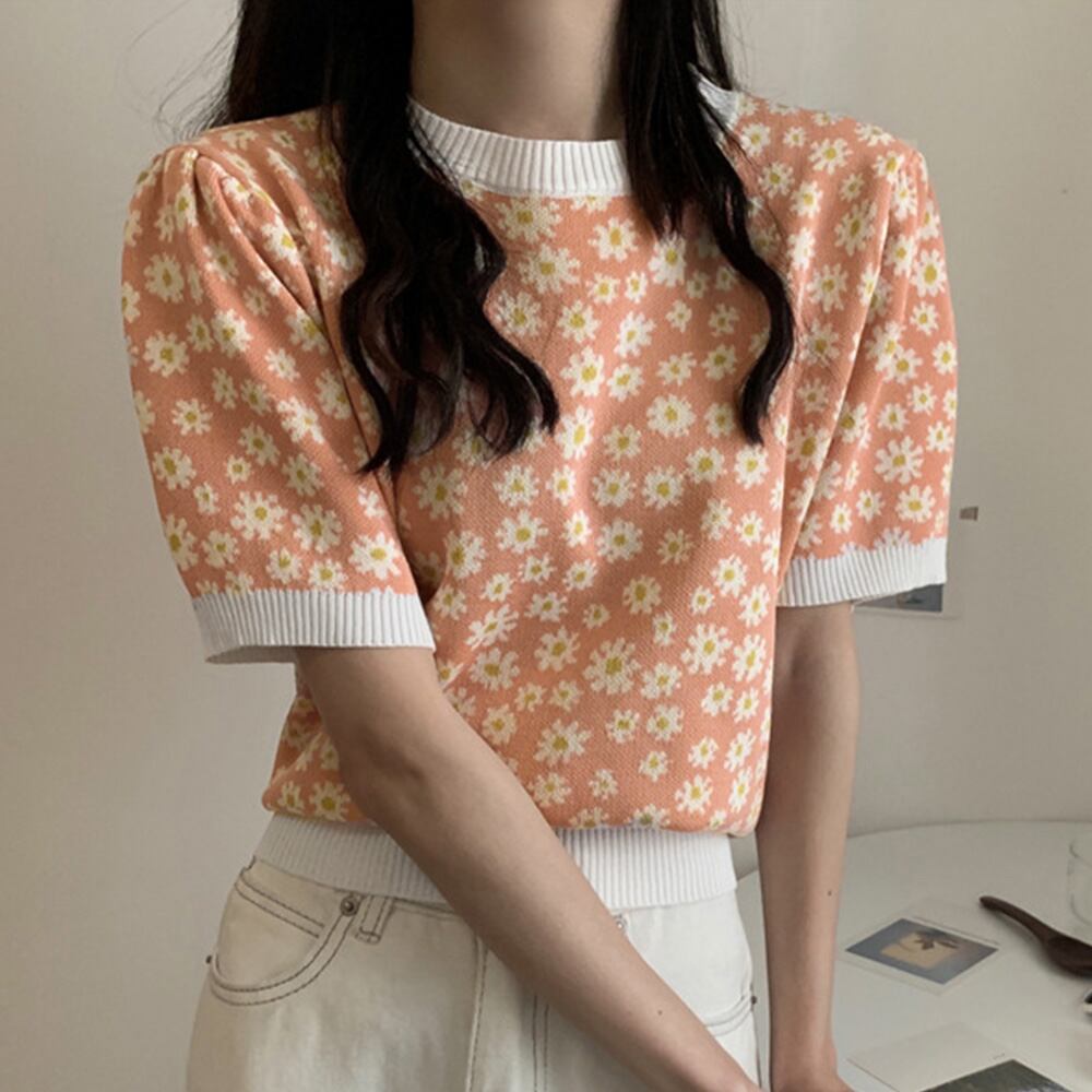 女性らしい花柄の総柄ニットはパフスリーブでフェミニンさを出しつつも