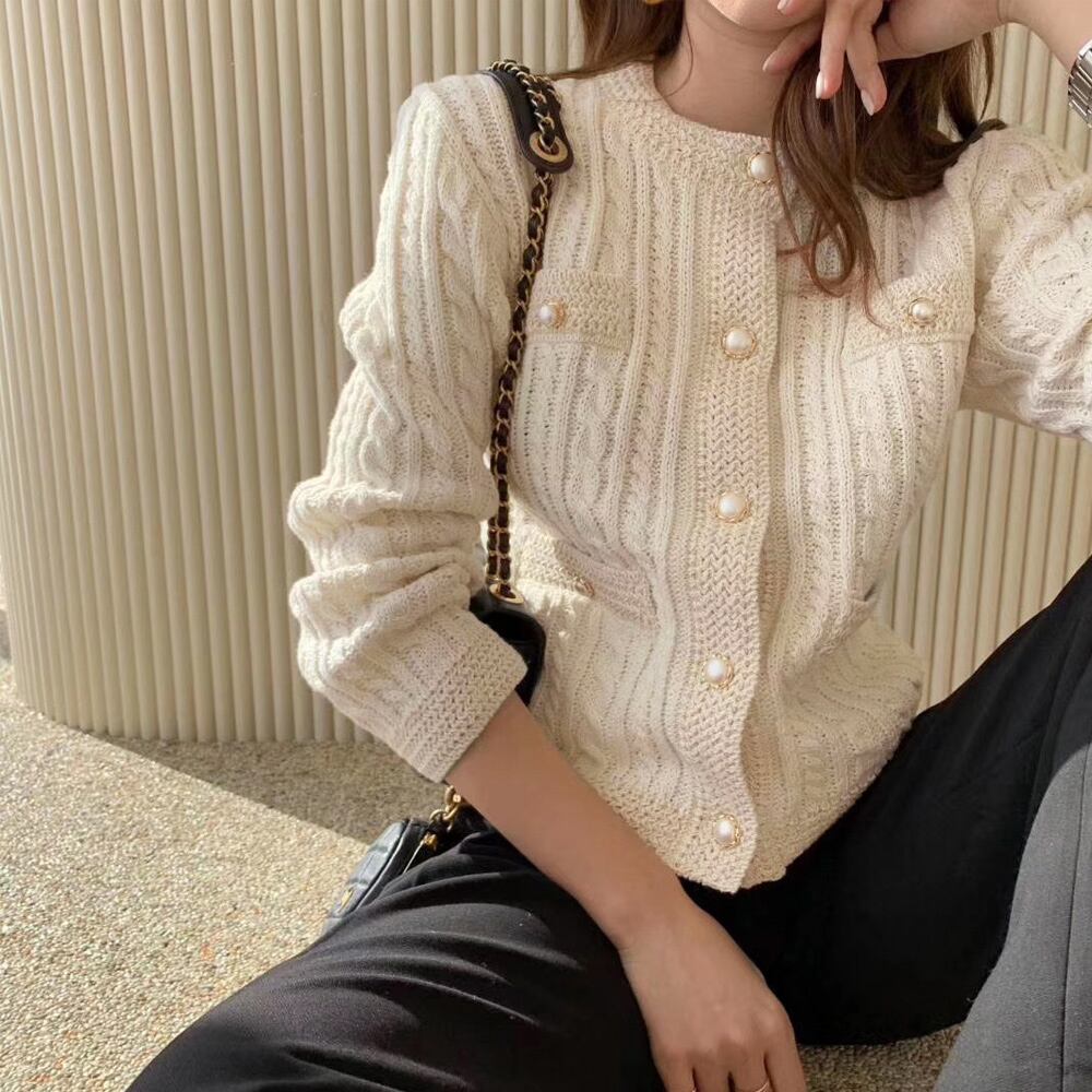 ショート丈 ニットトップス 長袖 レディース フェイクパールボタン 前開き ニットセーター おしゃれ アウター 韓国