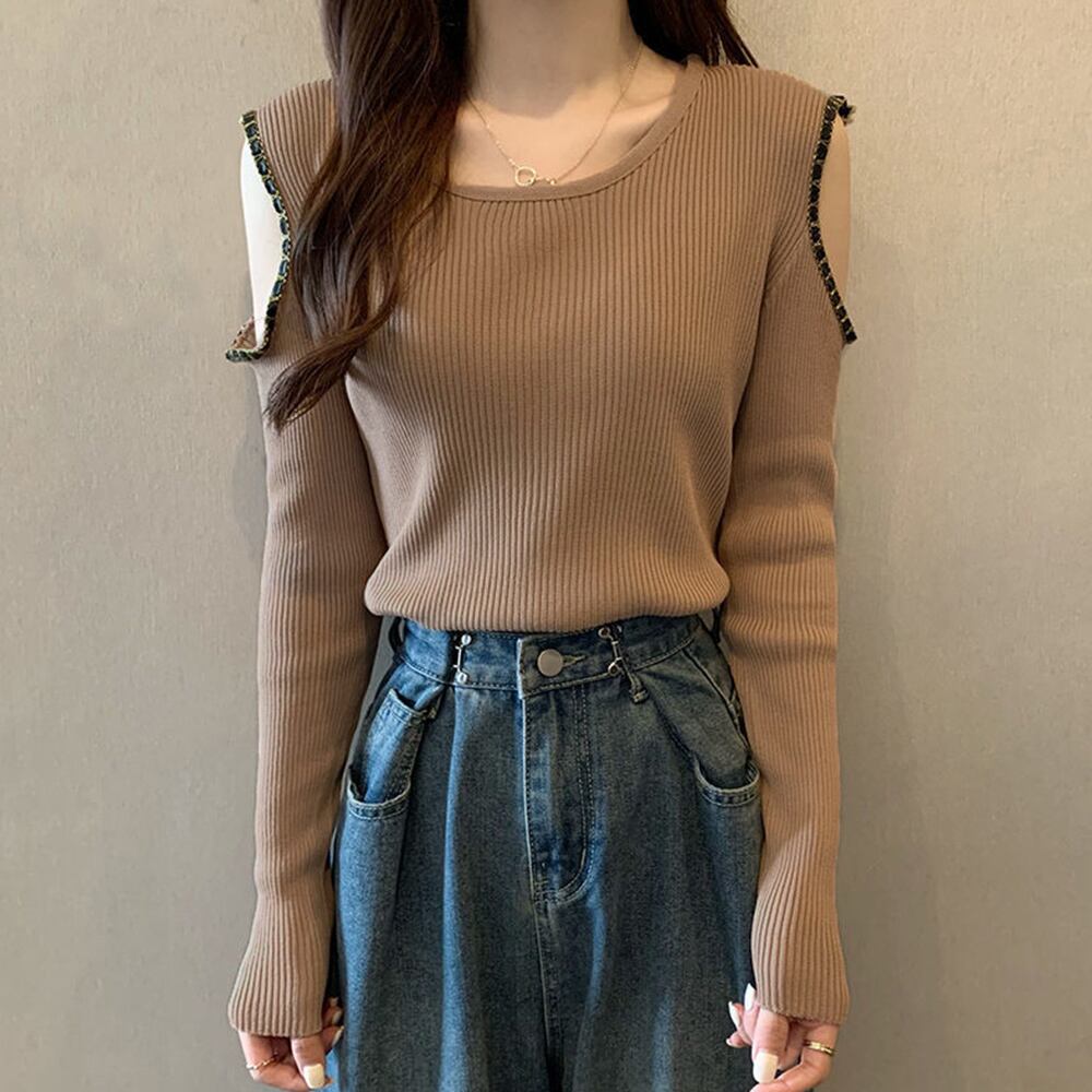 ニットソー 無地 ボーダー柄 ニットセーター セクシー オフショルダーニット クルーネック 肩見せ リブニット