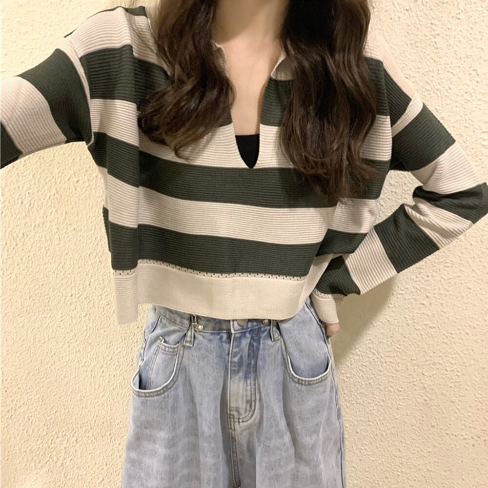 長袖Vネック トップス へそ出し ニット プルオーバー きれいめ 着やせ