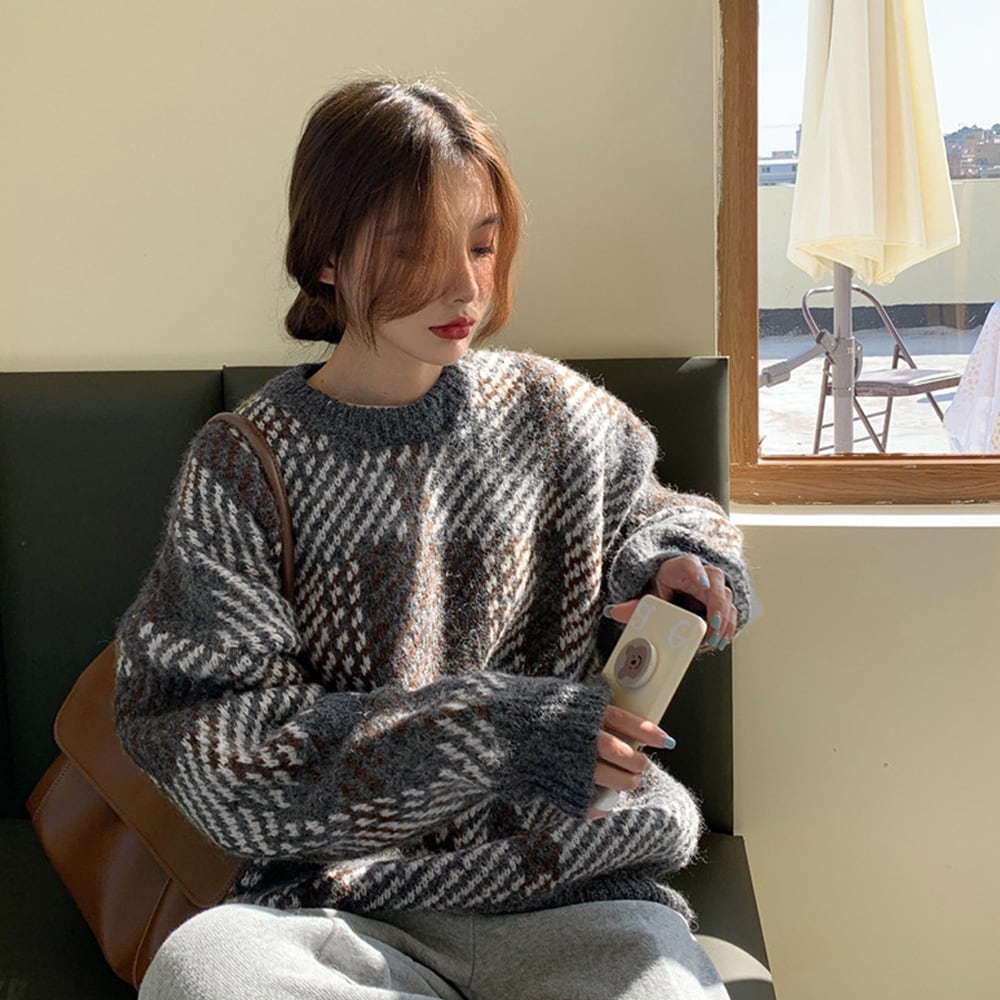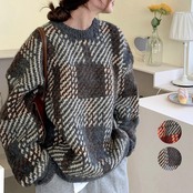 ニットセーター デカチェック柄 配色秋冬