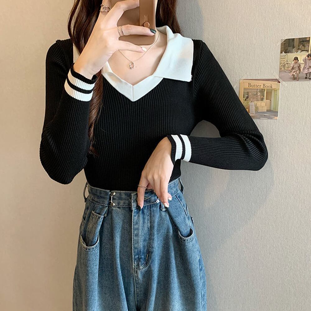 ニットトップス Vネック 襟付きニット