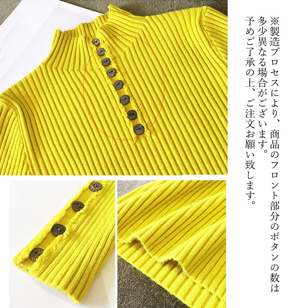 ニットトップス レディース ハイネック あったか セーター 冬 無地 女子会 長袖 飾りボタン ダメージ入り