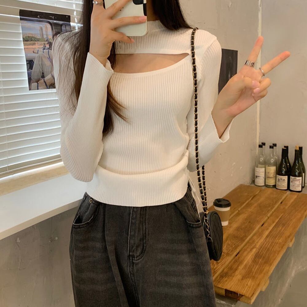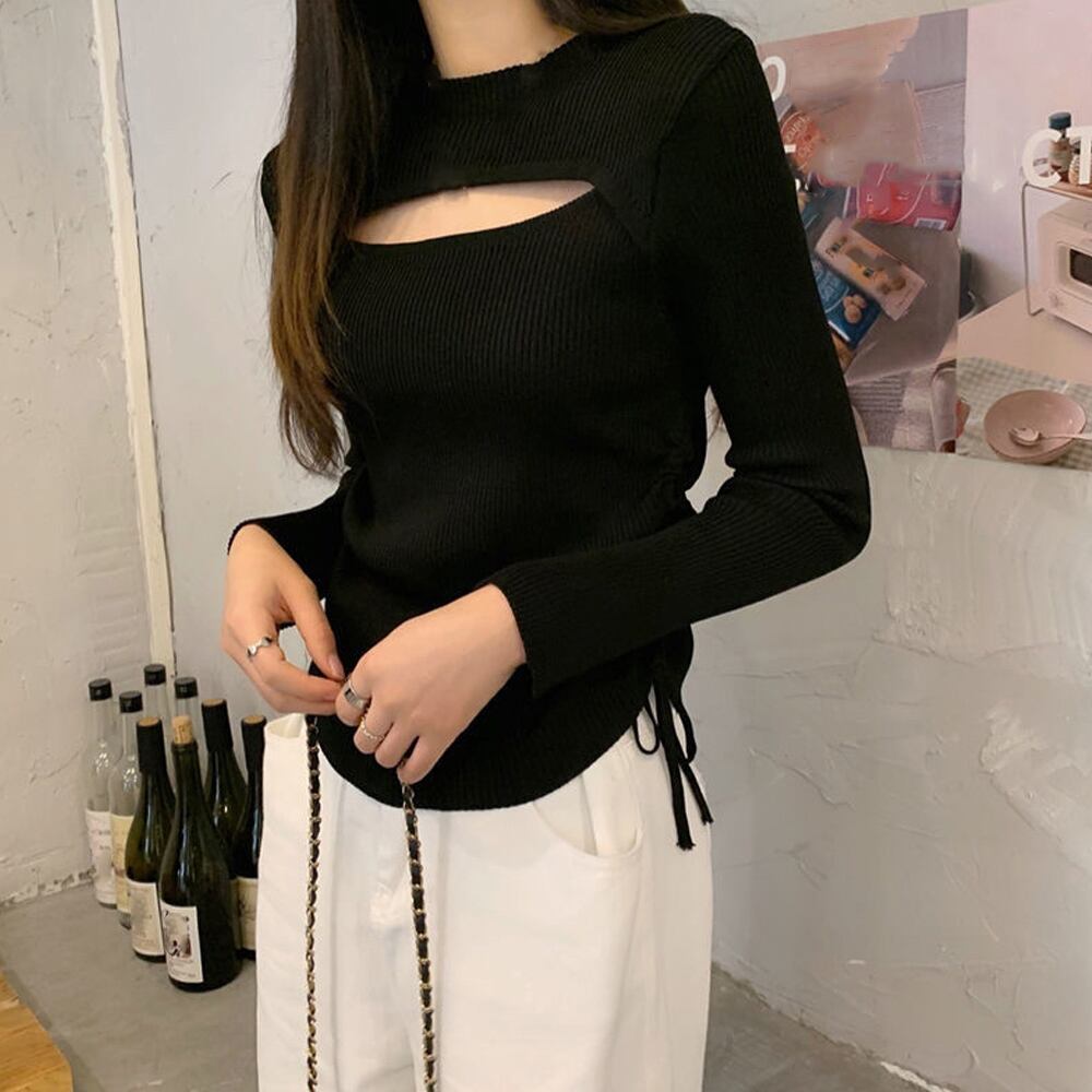 セクシー フェミニン ニットセーター 胸見せ タートルネック ニットインナー長袖 両サイドシャーリング ニットソー