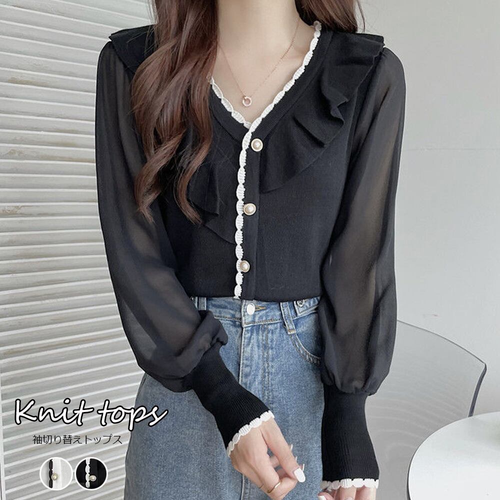 フリル襟とシアー素材のスリーブが女性らしさを際立たせる切替ニットトップス
