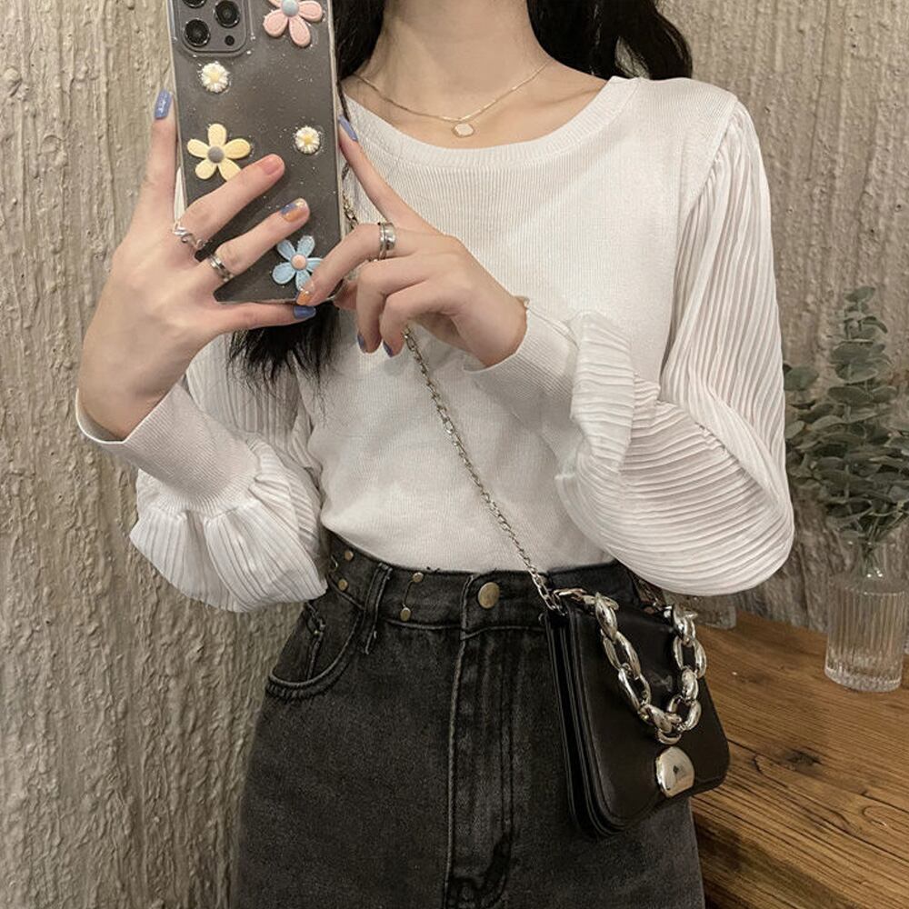 ボリューム袖 レディース ドッキングニット 切り替え 大人カジュアル クルーネック ニットソー フェミニン