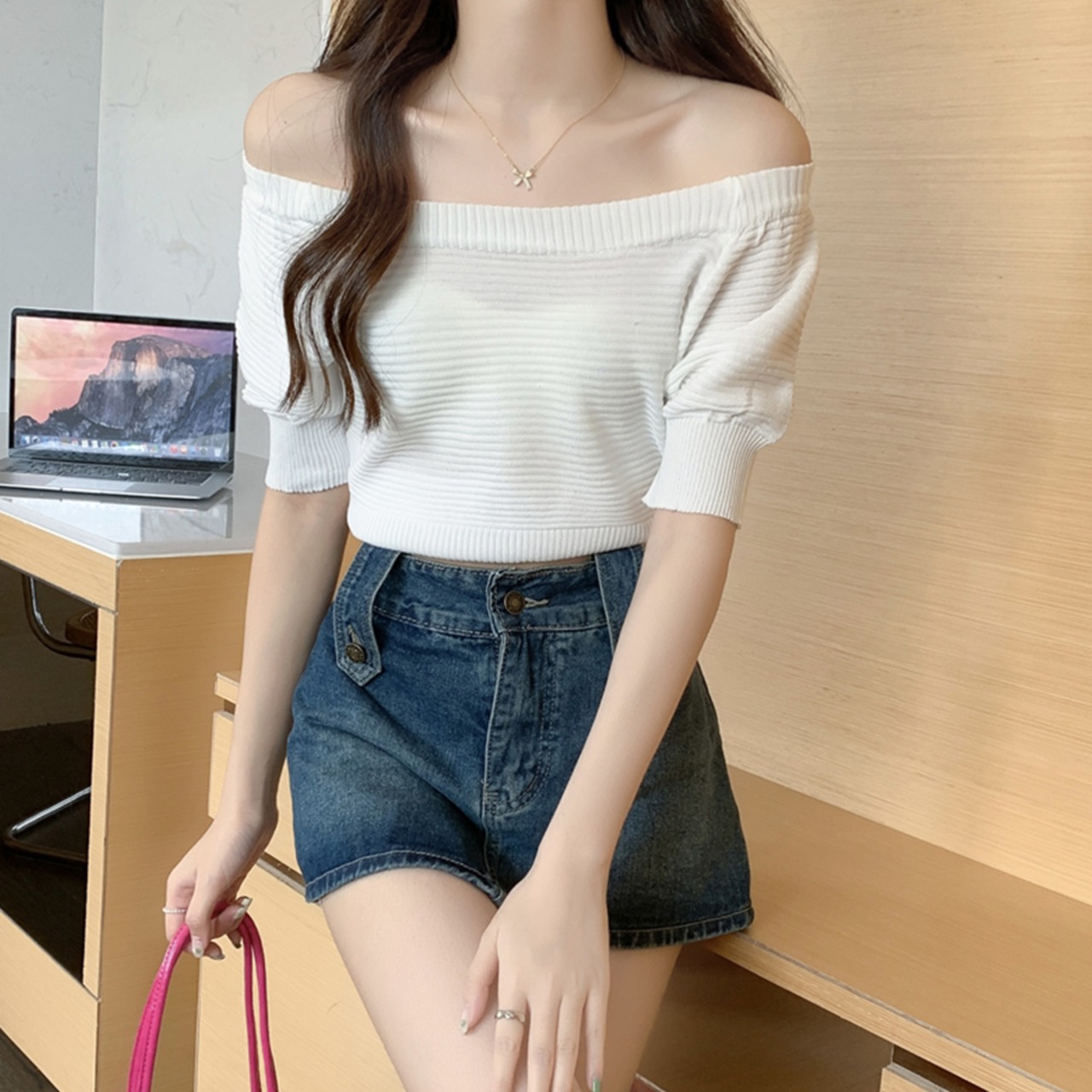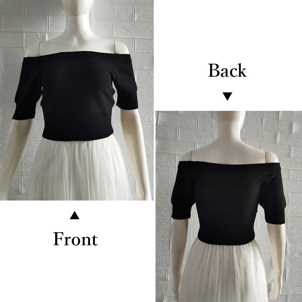 レディース 肩出し サマーニット ショート丈 リブニット セクシー 着やせ ニットソー鎖骨見せ トップス パフスリーブ