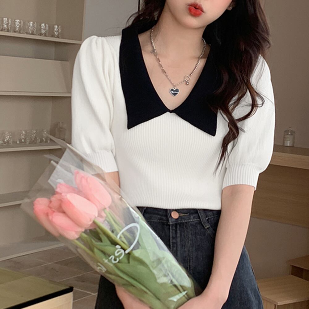 バイカラー 韓国風 リブニットカジュアル パフスリーブ ニットソー Vネック 着やせ トップス スリムフィット