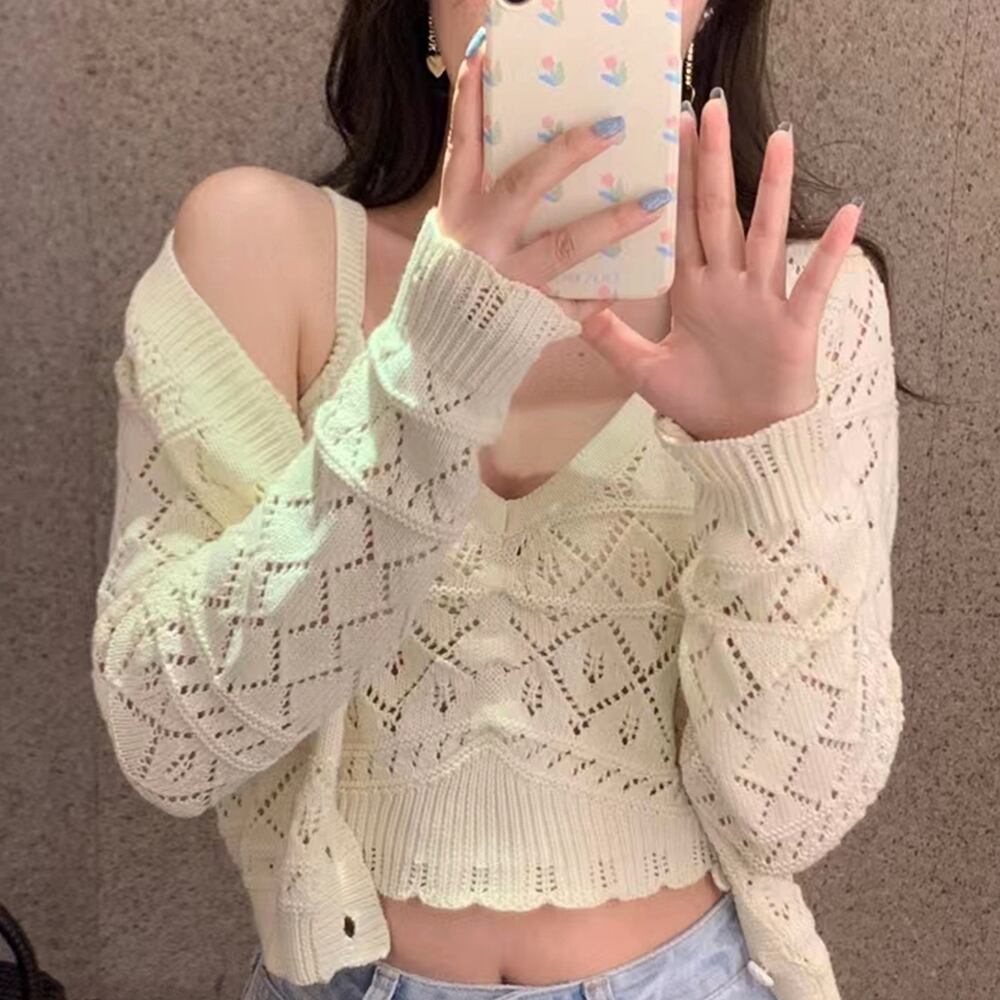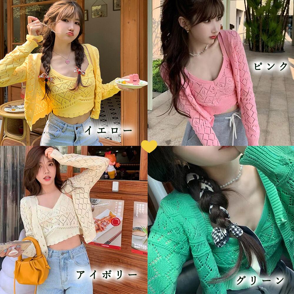 ショート丈 ニットトップス レディース セットアップ Vネック 前開き 韓国風カーデ クロップド キャミソール セクシー