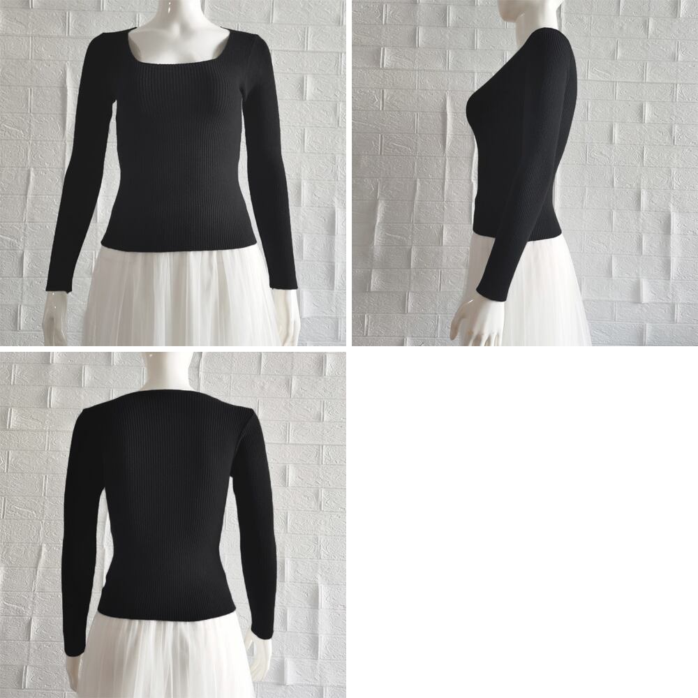 スクエアネック リブニットトップス 秋冬