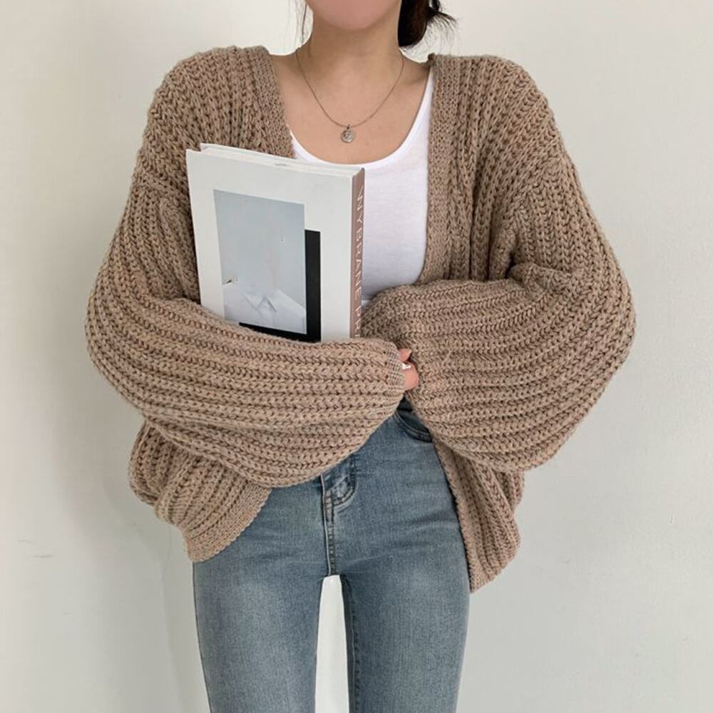カーディガン 韓国風 ゆるニットトップス 体型カバー ボリューム袖 長袖 ニットアウター 羽織り 春秋服 大人カジュアル