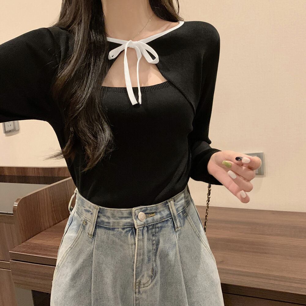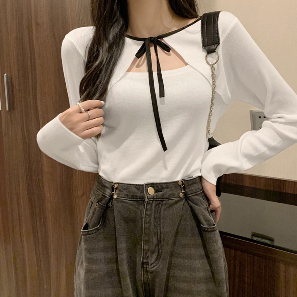 胸元カットトップス 長袖無地ニットソー ニットインナー韓国