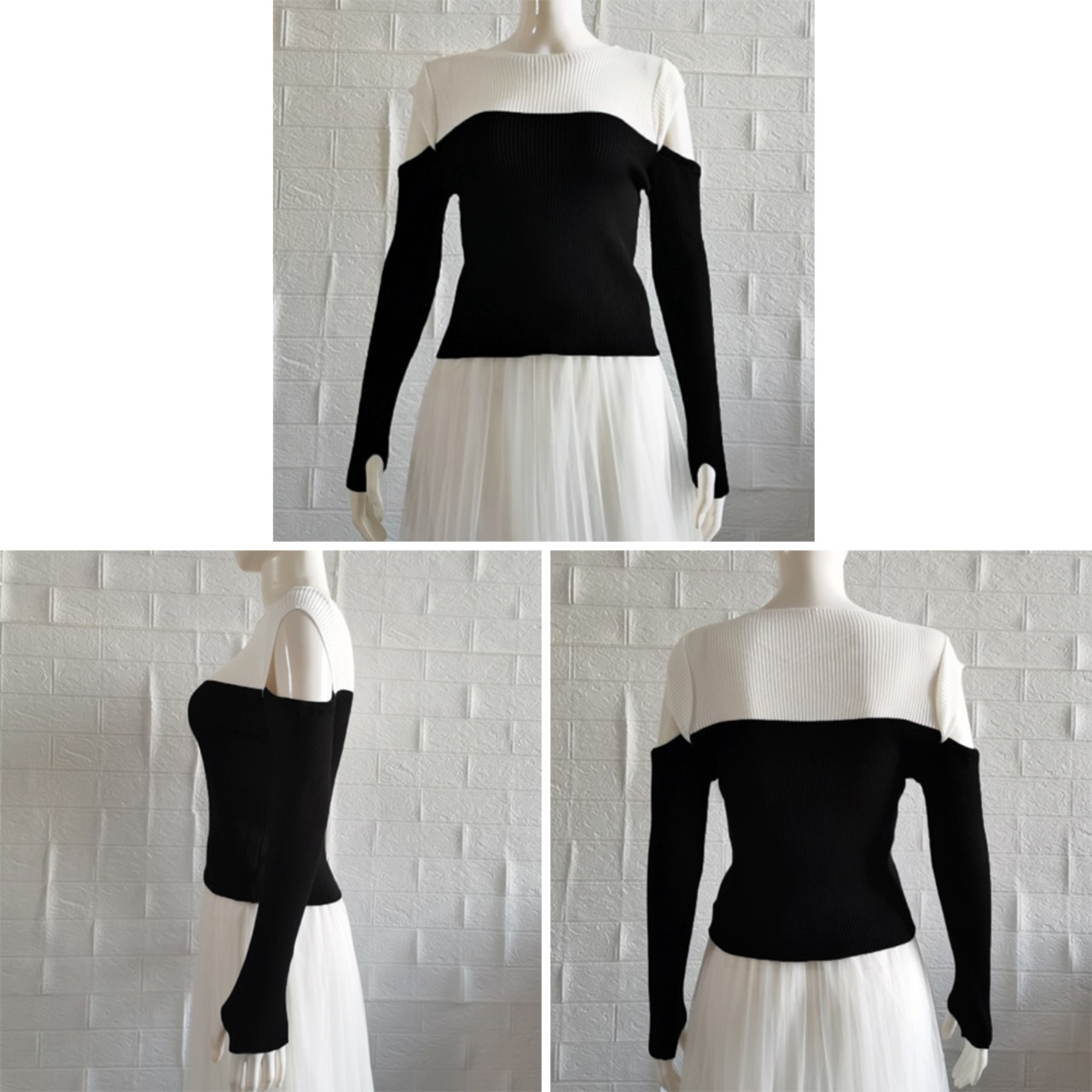 肩の部分をカットすることによってオフショルのような大人っぽガーリーデザインのニットトップス
