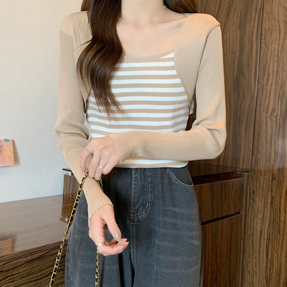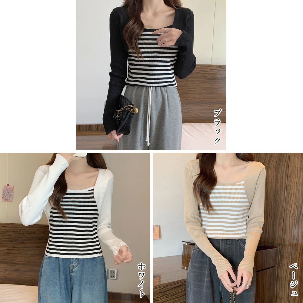 ボーダー柄身頃と無地袖を合わせたレイヤード風デザインが目を惹くスクエアネックニットトップス