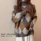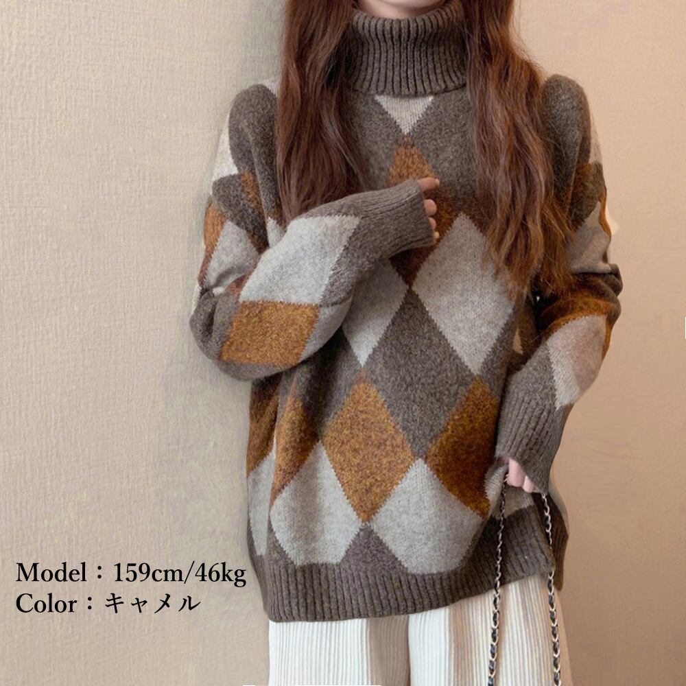 配色感はレトロな雰囲気が漂うアーガイル柄タートルネックニットトップス