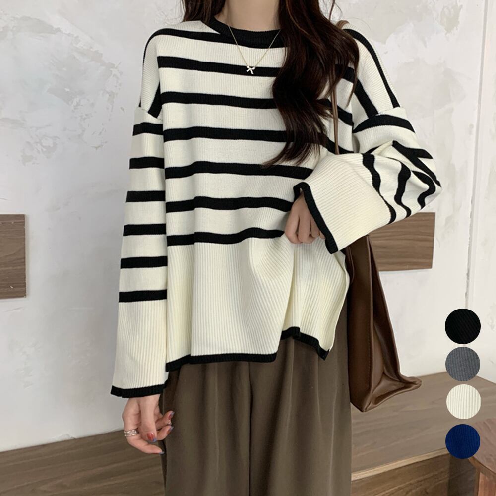 ボーダー柄ニットトップス サイドスリット