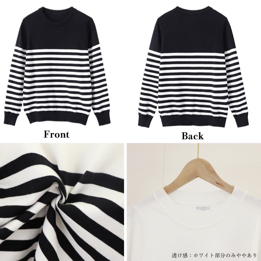 春秋に欠かせない定番のアイテム間違いなし、カジュアルなデザインで若い印象を与えるボーダー柄ニットセータ