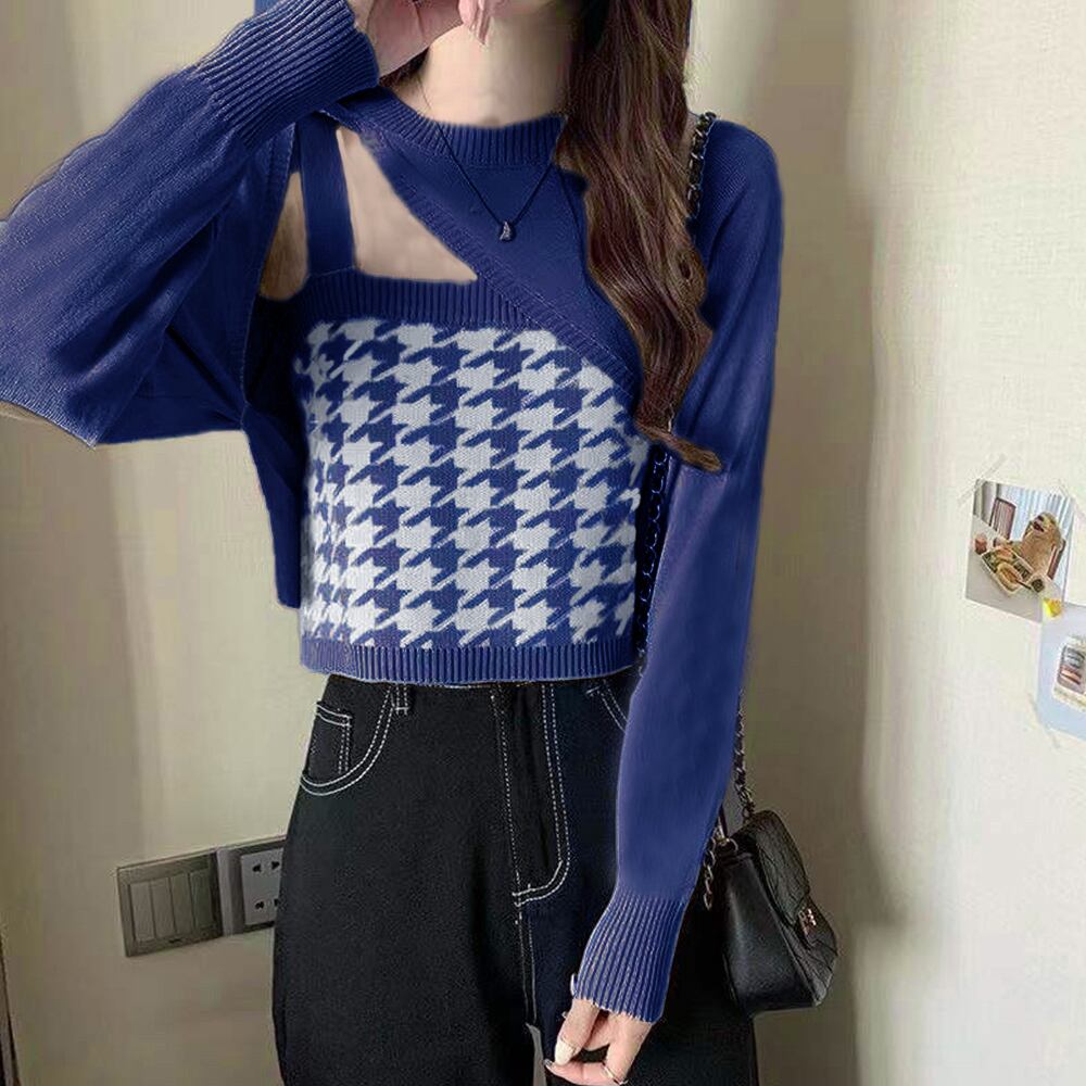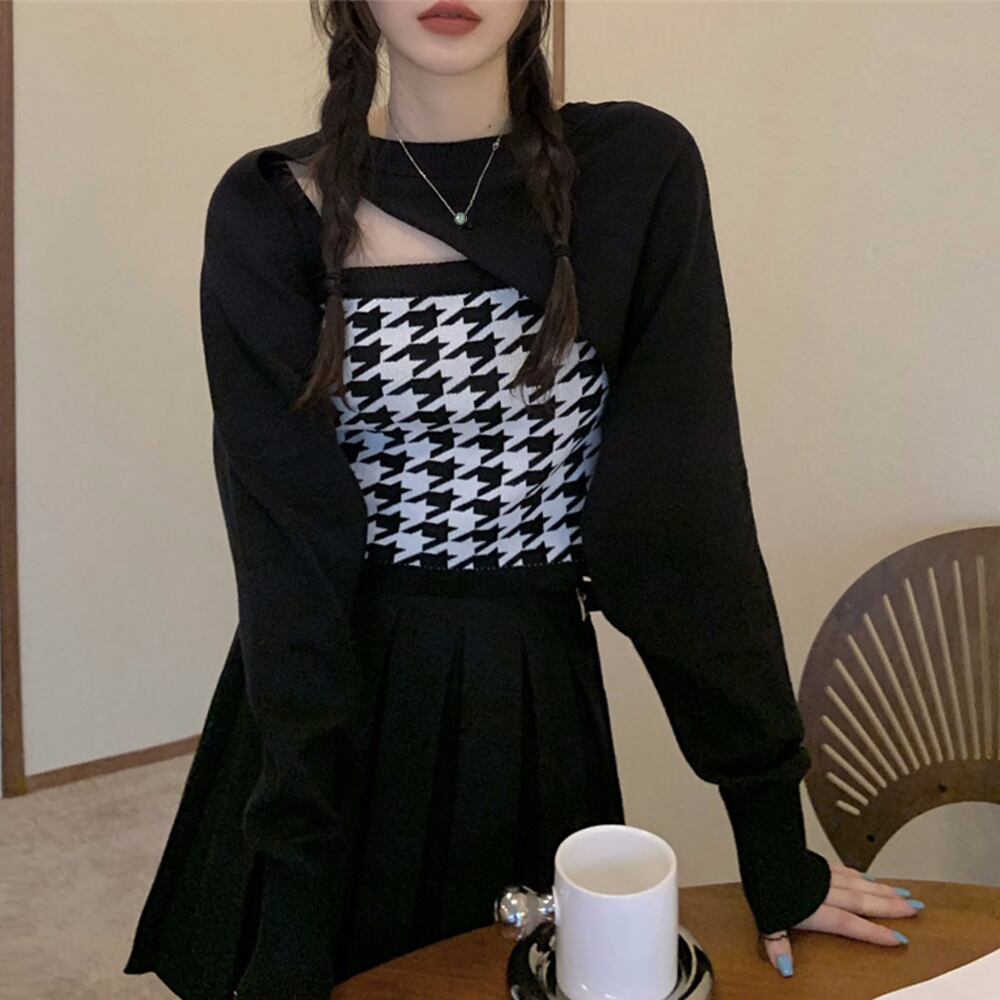 秋冬コーデに注目される千鳥格子柄レトロ風ニット2点セット