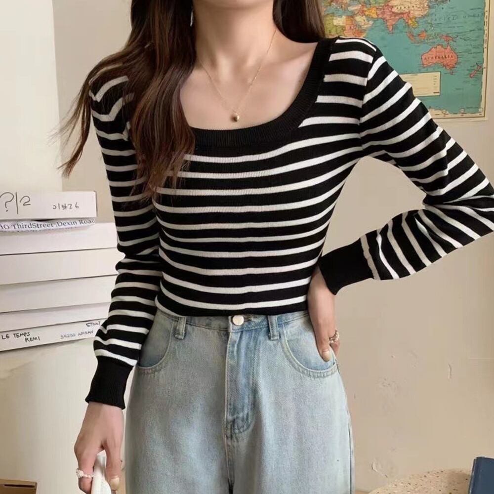 程よい開いたスクエアネックでデコルテラインを綺麗に見せてくれるボーダー柄ニットトップス